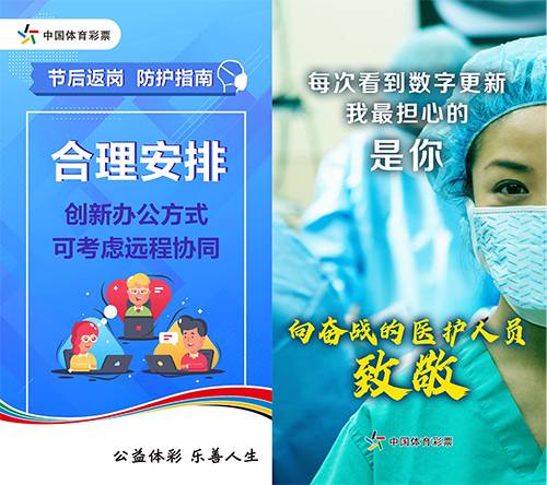 为增强体彩从业人员和购彩者的防疫意识,在这场疫情防控阻击战中,各地体彩中心在强调防疫工作的“真枪实弹”外,还从渠道、模式上下功夫,以突出特色亮点的宣传工作为“先手棋”,打开防疫工作“突破口”。比如,一张张“共抗疫情”的温暖海报让人动容;图文版节后返岗防控指南一目了然,生动形象;2020“在家健身”全民挑战赛让体彩从业者们在家里运动起来……