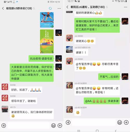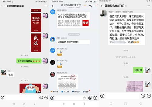 浙江杭州体彩中心的微信群里,防疫知识、宣传海报、倡议书等防疫宣传品不断更新,大家积极转发。湖南郴州市安仁县金紫仙镇莲塘村党支部发出号召,动员党员参加疫情防控工作,体彩专管员贺晓鹏看到湖南省体彩中心推送的倡议书后,在党支部微信群里第一个响应“我报名”。