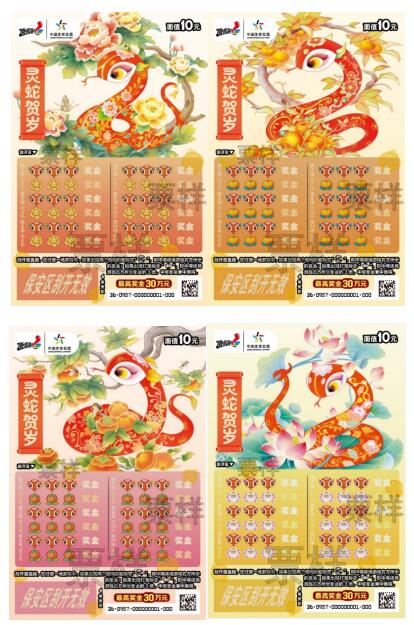 “巳蛇”游戏面值为5元,9个票面;“灵蛇贺岁”游戏面值为10元,4个票面;“红包来啦 让好事发生2025”游戏面值为10元,10个票面;“灵蛇献瑞”游戏面值为20元,3个票面;“抢头彩2025”游戏面值为30元,2个票面;“新春大吉2025”游戏面值为50元,1个票面。