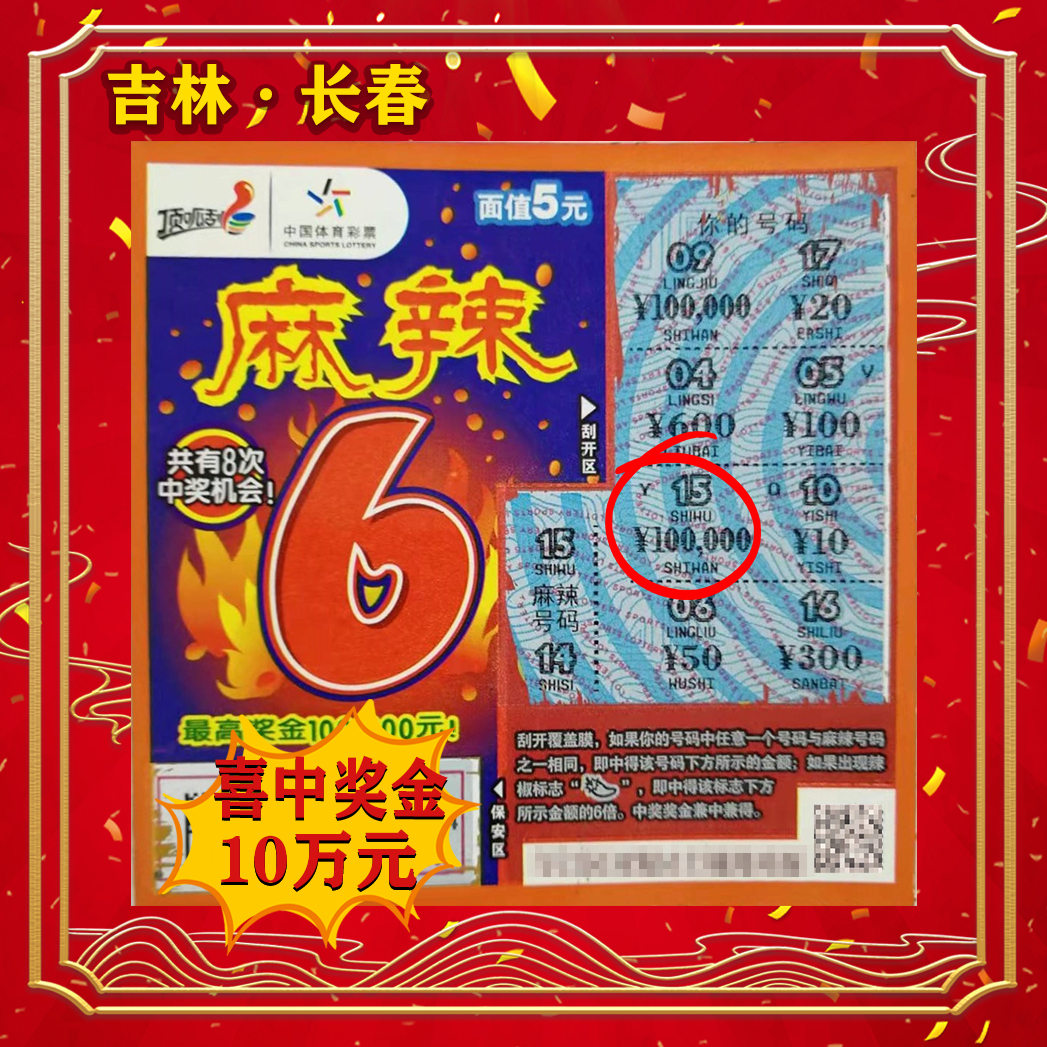 公主岭购彩者刮出“麻辣6”一等奖10万元,激动到手发抖2023-05-12 -